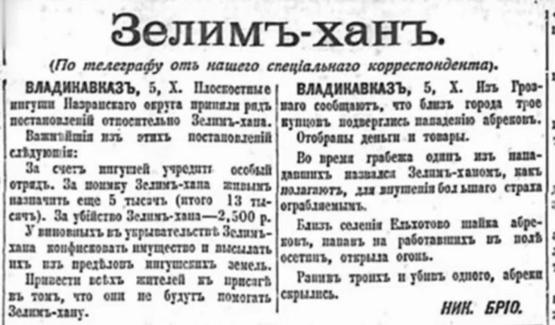 Владикавказ, 5. Х. Из Грозного сообщают, что близь города трое купцов подверглись нападению абреков. Отобраны деньги и товары. Во время грабежа один из нападавших назвался Зелим-Ханом, как полагают, для внушения большего страха ограбленным. Близь селения Ельхотово шайка абреков, напав на работавших на поле осетин, открыла огонь. Ранив троих и убив одного, абреки скрылись.