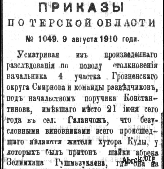 «Усматривая из произведенного расследования по поводу столкновения начальника 4 участка Грозненского округа Смирнова и команды разведчиков, под начальством поручика Константинова, имевшего место 21 июня сего года в сел. Галанчож, что безусловными виновниками всего происшедшего являются жители хутора Кулы, у которых был притон шайки абрека Зелимхана . . .© 2016 abrek.org Портал Абрек